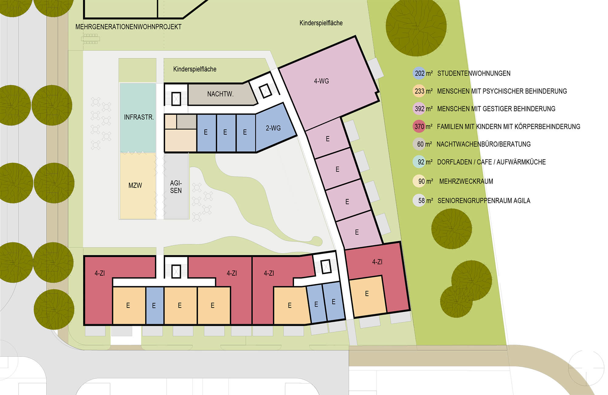 Mehrfamilienwohnhaus mit 81 WE, öffentlich gefördert, frei finanziert / integrierte Wohnungen für Menschen mit unterschiedlichem Betreuungsbedarf / Betreuungs- und Beratungsstützpunkt mit Büros und Bereitschaftszimmer / Stadtteilladen / Gemeinschaftsräume / Tiefgarage / Mehrgenerationenwohnprojekt mit 35 WE und Gemeinschaftsraum